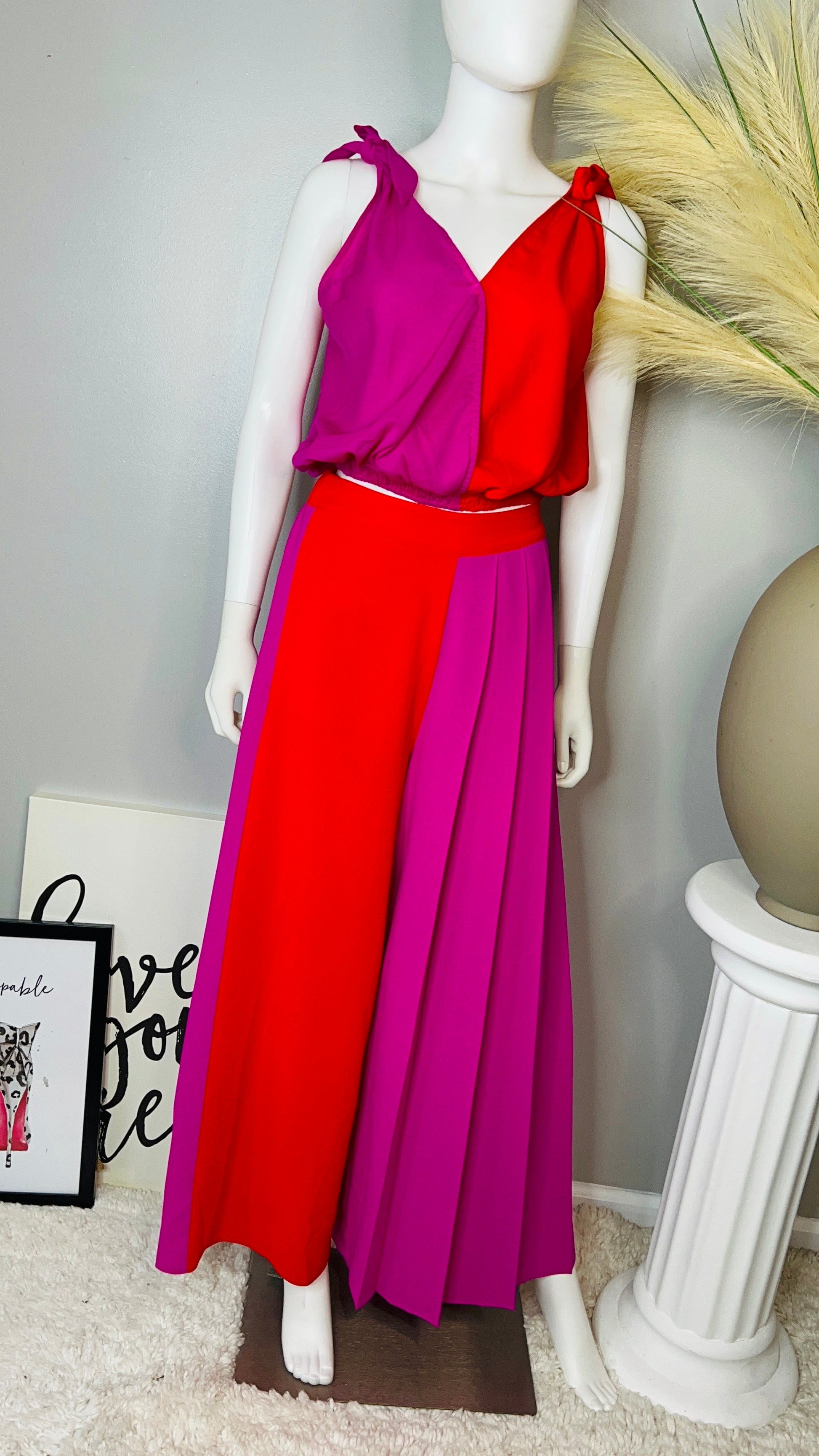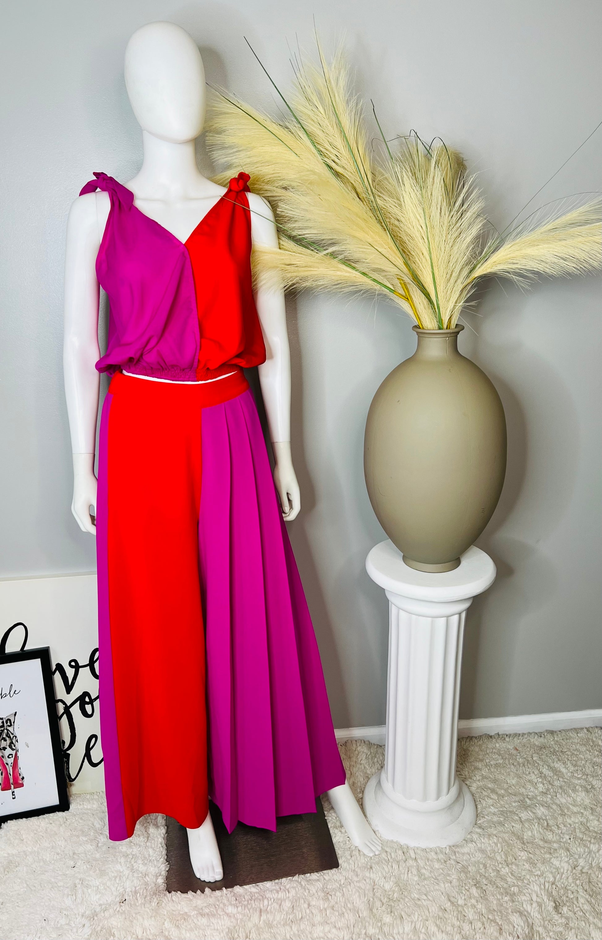 You will turn heads in any room in this hot pink and red color-block pleated wide leg pants with coordinating shoulder tie top that has an elastic waist. The pants are straight one one side and pleated on the other side with elastic waistband one the back. You can easily interchange these items with other staples in your closet. Grab a cute heel, clutch and head to your next event.