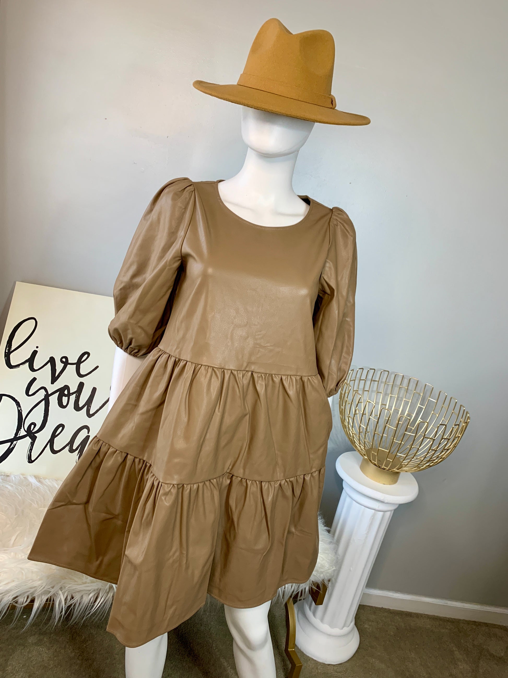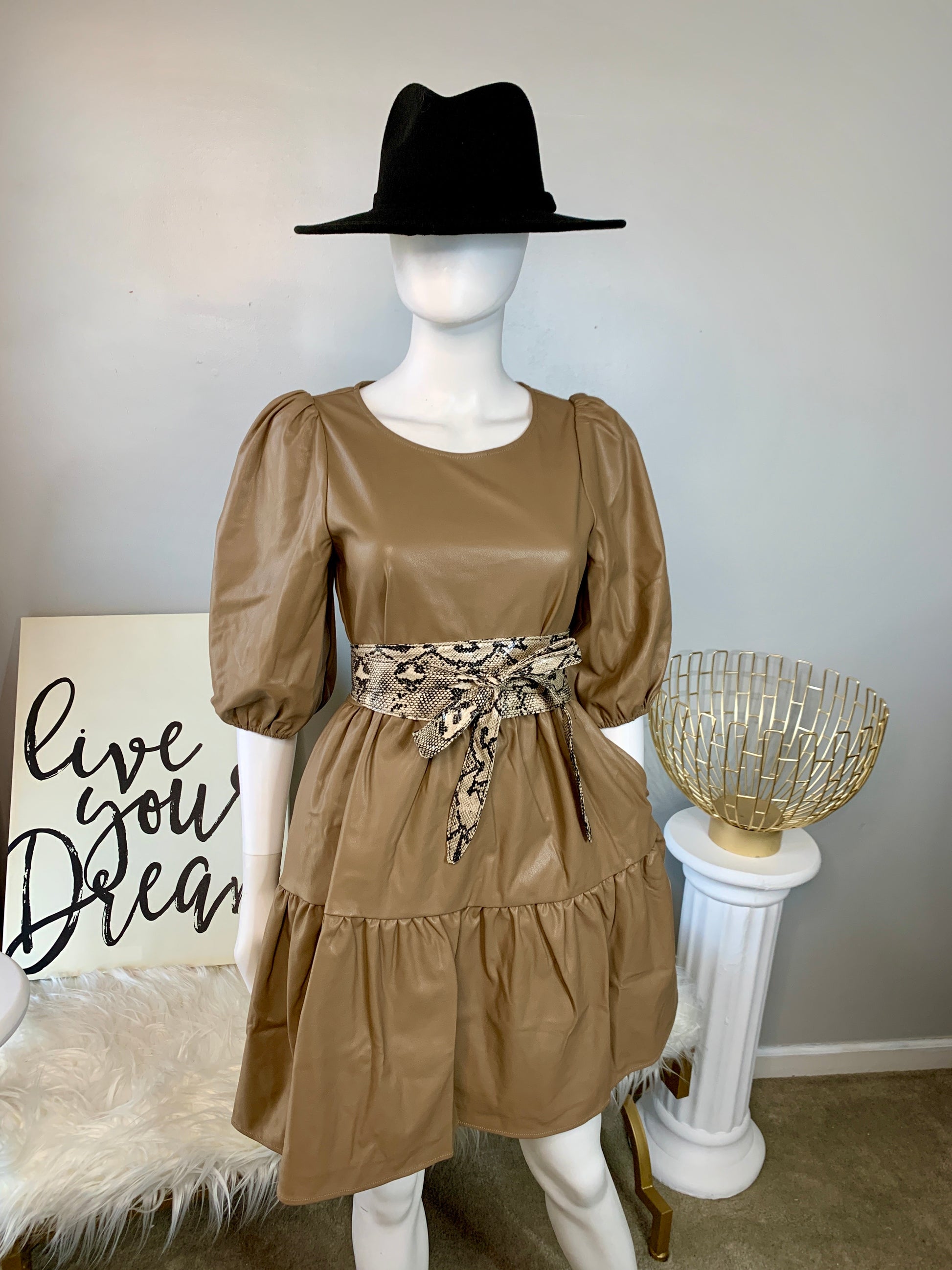 The Tiered Up A-Line Faux Leather Dress is one of our favorite Fall tends this season. It features an a-line silhouette with a tiered skirt and ruffle detailing. It also has puff sleeves that stops at the elbow. it also has out favorite...POCKETS! It has a loser fit so it is a 1/2 size bigger. Belt is sold separately here.